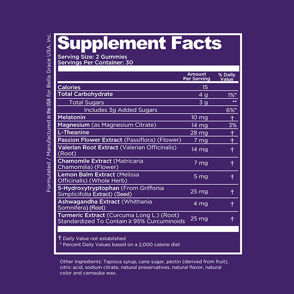 Take two gummies 30 minutes before bedtime. Let the calming blend of botanicals and nutrients lull you into a restful slumber while your body restores itself from head to toe.